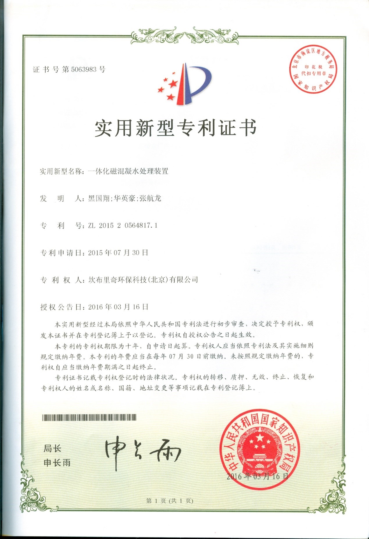 2016年3月16日,公司取得的由中华人民共和国国家知识产权局颁发的专利证书,专利名称为一体化磁混凝水处理装置。