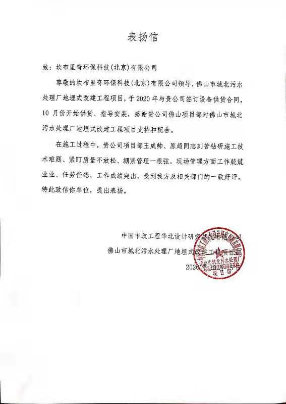2020年5月,我司与该院签订佛山市城北污水处理厂设备供货合同,合同签订后,我司按照合同约定开始供货、指导安装,在施工过程中,我司的产品和服务获得了甲方的好评,赢得了好口碑,树立了良好的企业形象!