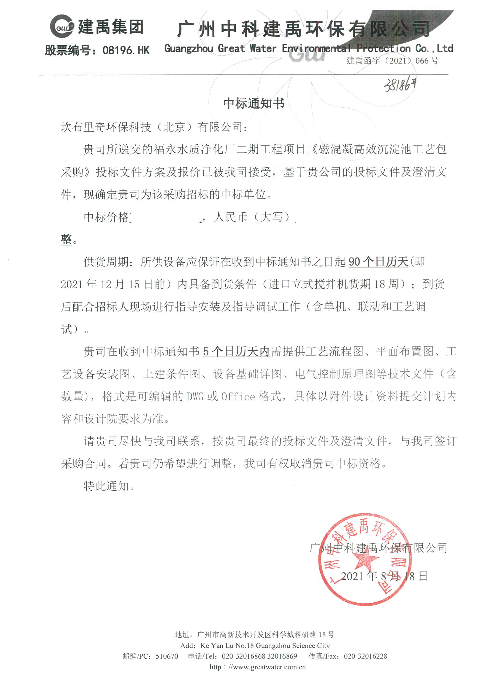 喜讯!2021年8月18日,广州中科建禹环保有限公司发来中标通知书,我司喜中深圳福永水质净化厂二期工程项目,该项目位于广东省深圳市,日处理量22.5万m3/d,出水水质要求TP≤0.24mg/L,SS≤6.4mg/L,这是我司承接的第7个日处理规模达到20万m3的项目,也是我司与深圳市水务(集团)有限公司合作的第3个项目,感谢深水集团一直以来对我司磁混凝污水处理技术的认可和信任,我司一定不负众望,在合同约定的期限内保质、保量地完成该项目,也期待双方以后有更多的机会合作,互惠互利,共创未来!